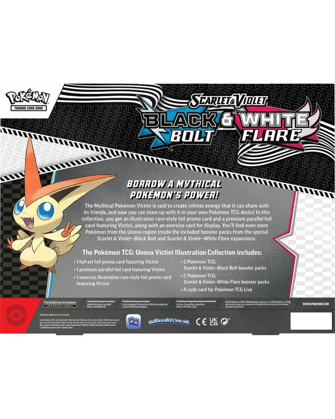 The Mythical Pokémon Victini is said to create infinite energy that it can share with its friends, and now you can team up with it in your own Pokémon TCG decks! In this collection, you get an illustration rare-style foil promo card and a premium parallel foil card featuring Victini, along with an oversize card for display. You’ll find even more Pokémon from the Unova region inside the included booster packs from the special Scarlet & Violet - Black Bolt and Scarlet & Violet - White Flare expansions.
